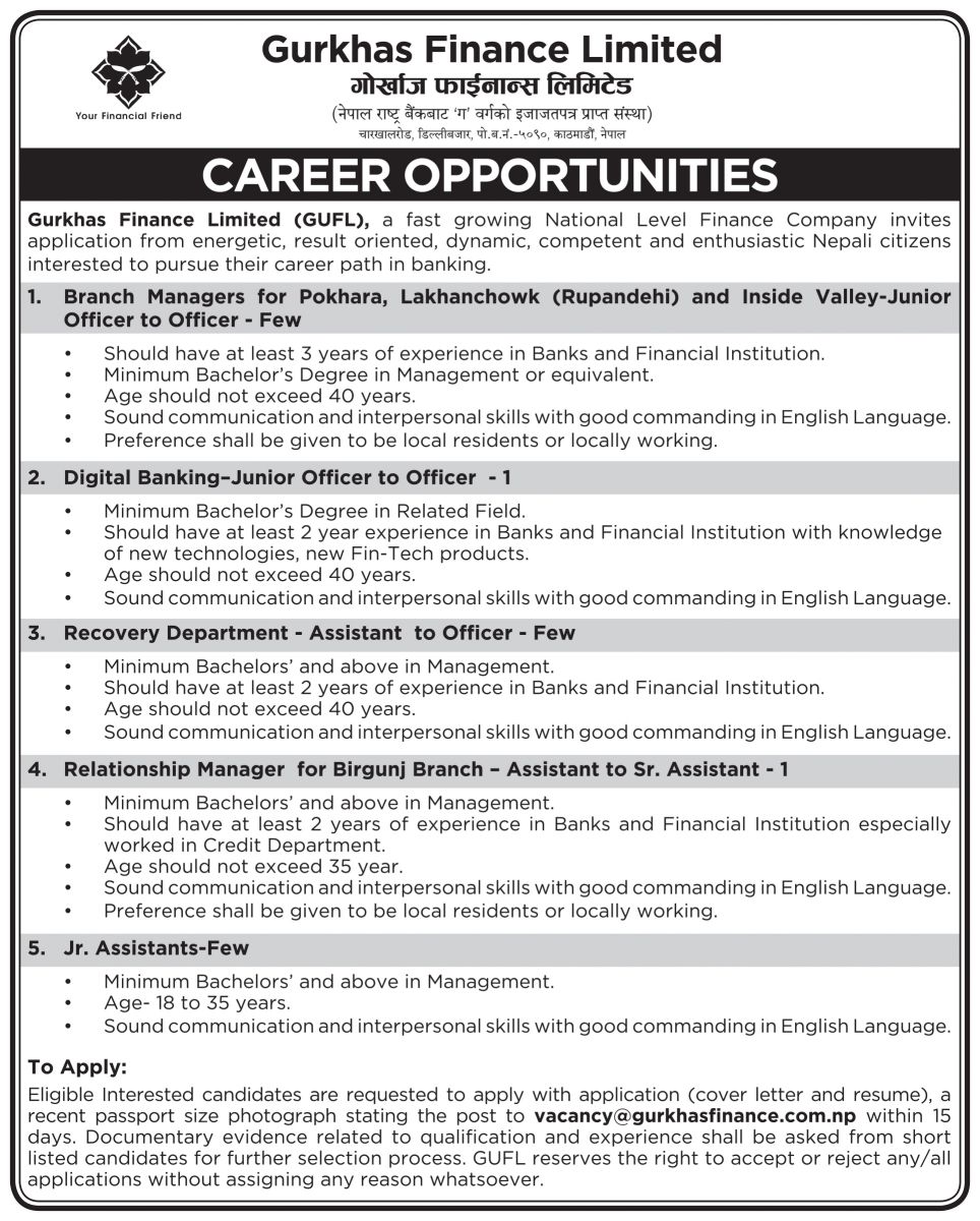 Gurkhas Finance Limited (GUFL), a fast growing National Level Finance Company invites application from energetic, result oriented, dynamic, competent and enthusiastic Nepali citizens interested to pursue their career path in banking.